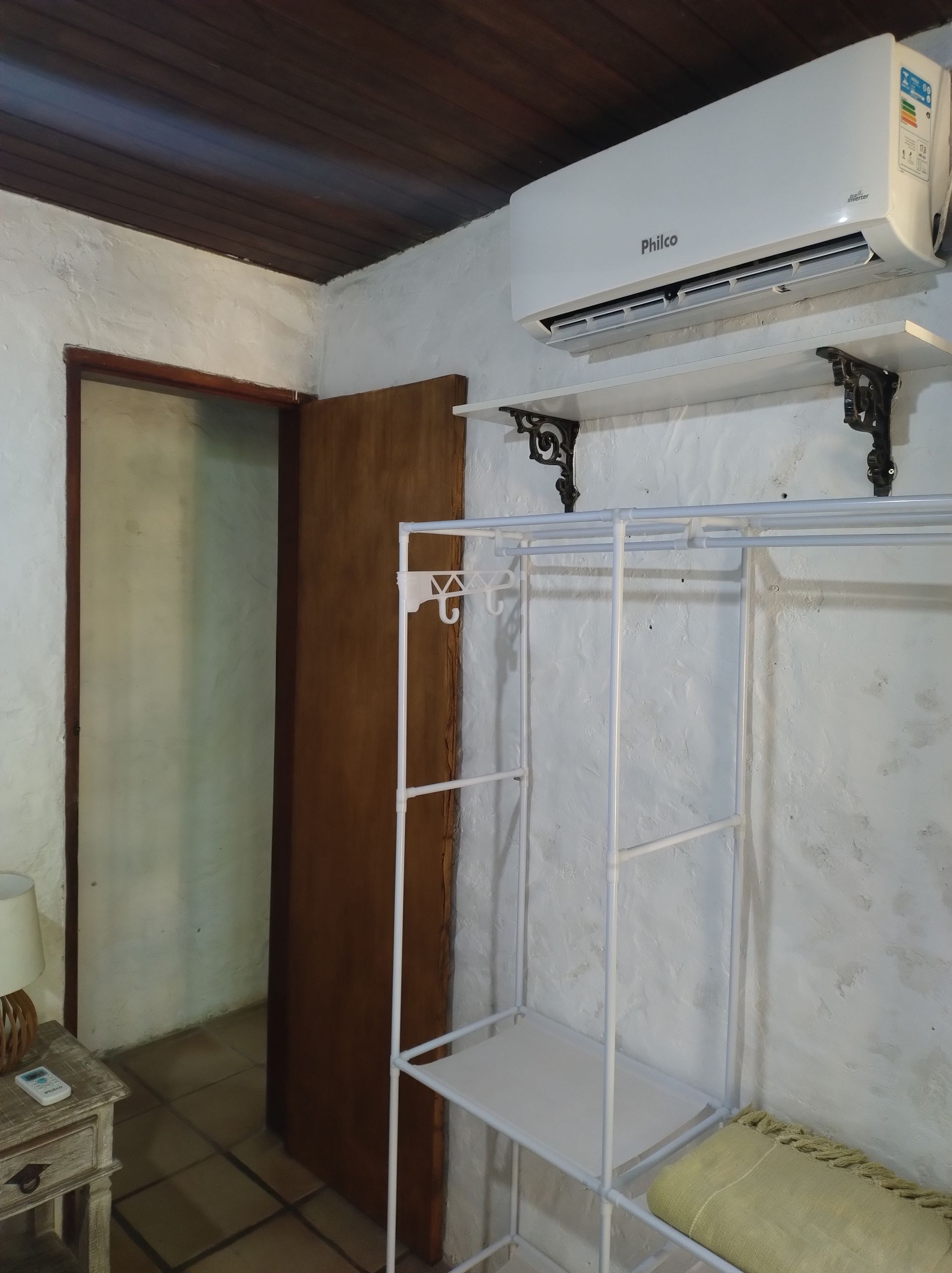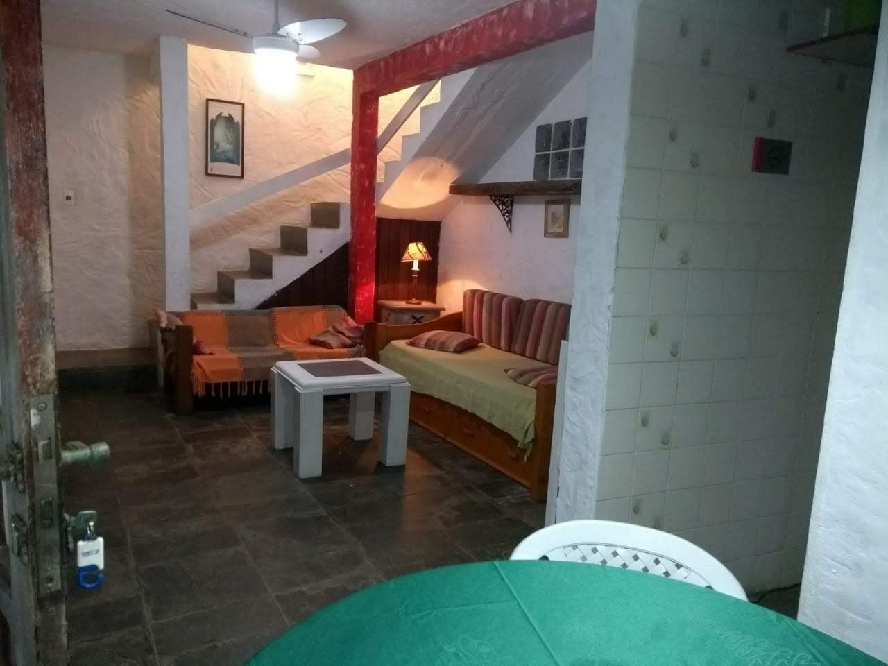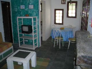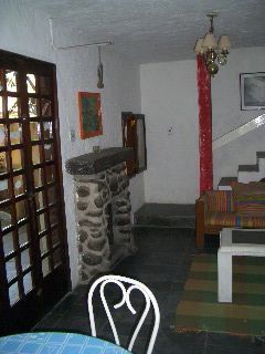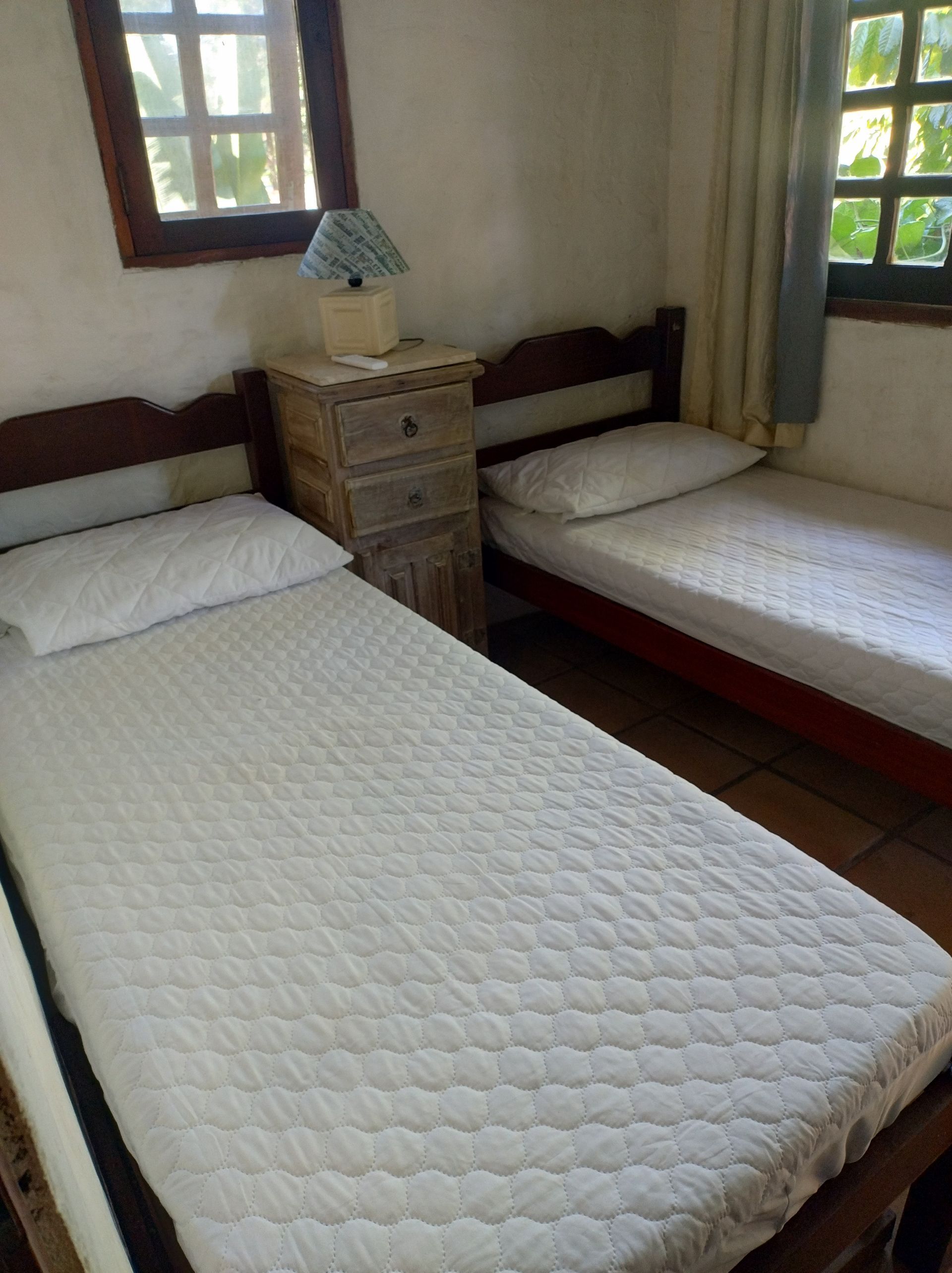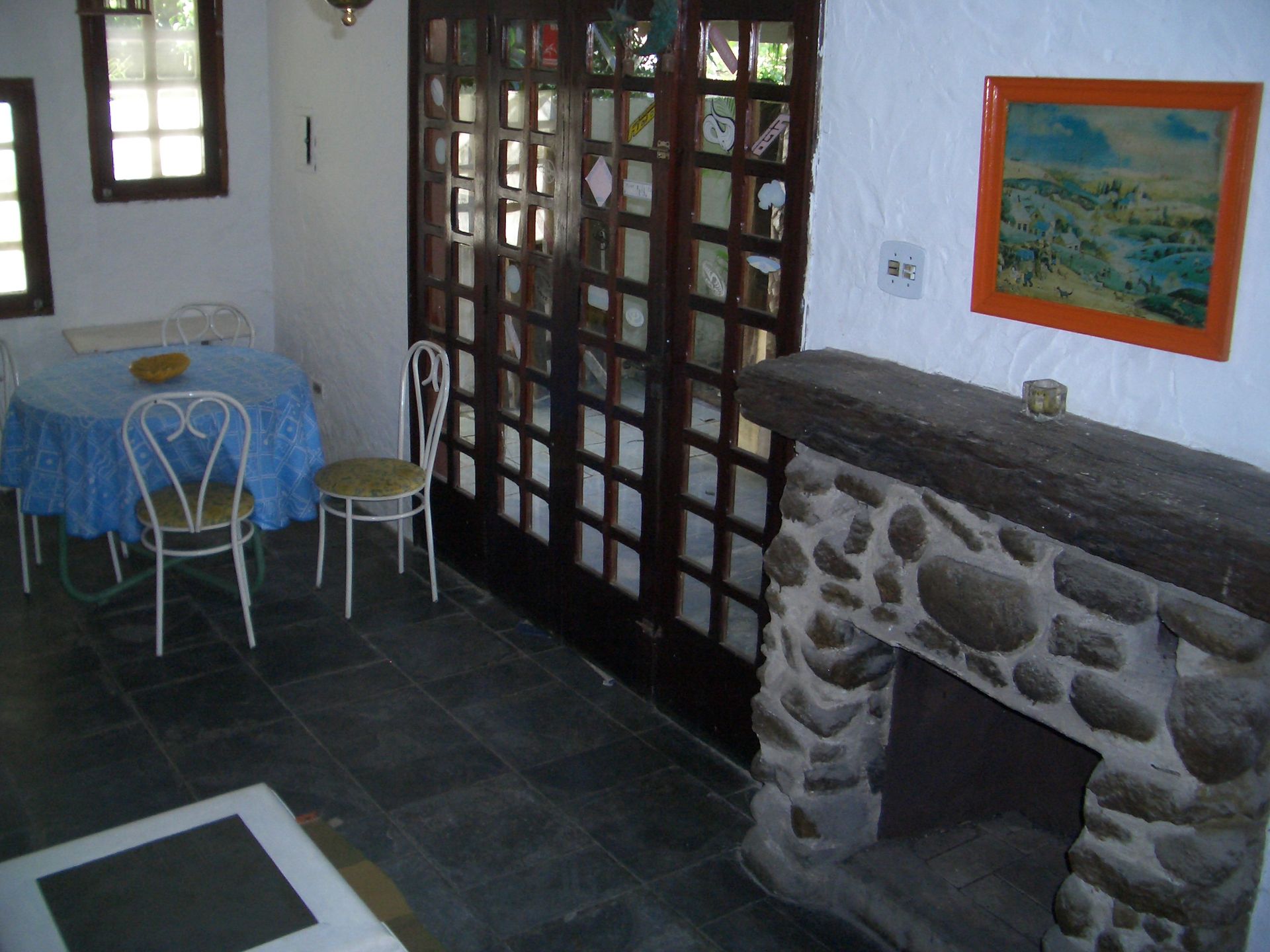 2 quartos, sendo 1 com cama de casal (mais um berço, quando necessário) e com ar condicionado, e outro quarto com 2 camas de solteiro e com ar condicionado/ banheiro / sala (com lareira) e 1 bi-cama/sofá / lavabo / cozinha / terraço / churrasqueira / estacionamento para 1 carro. (Para 5, no máximo 6 pessoas).